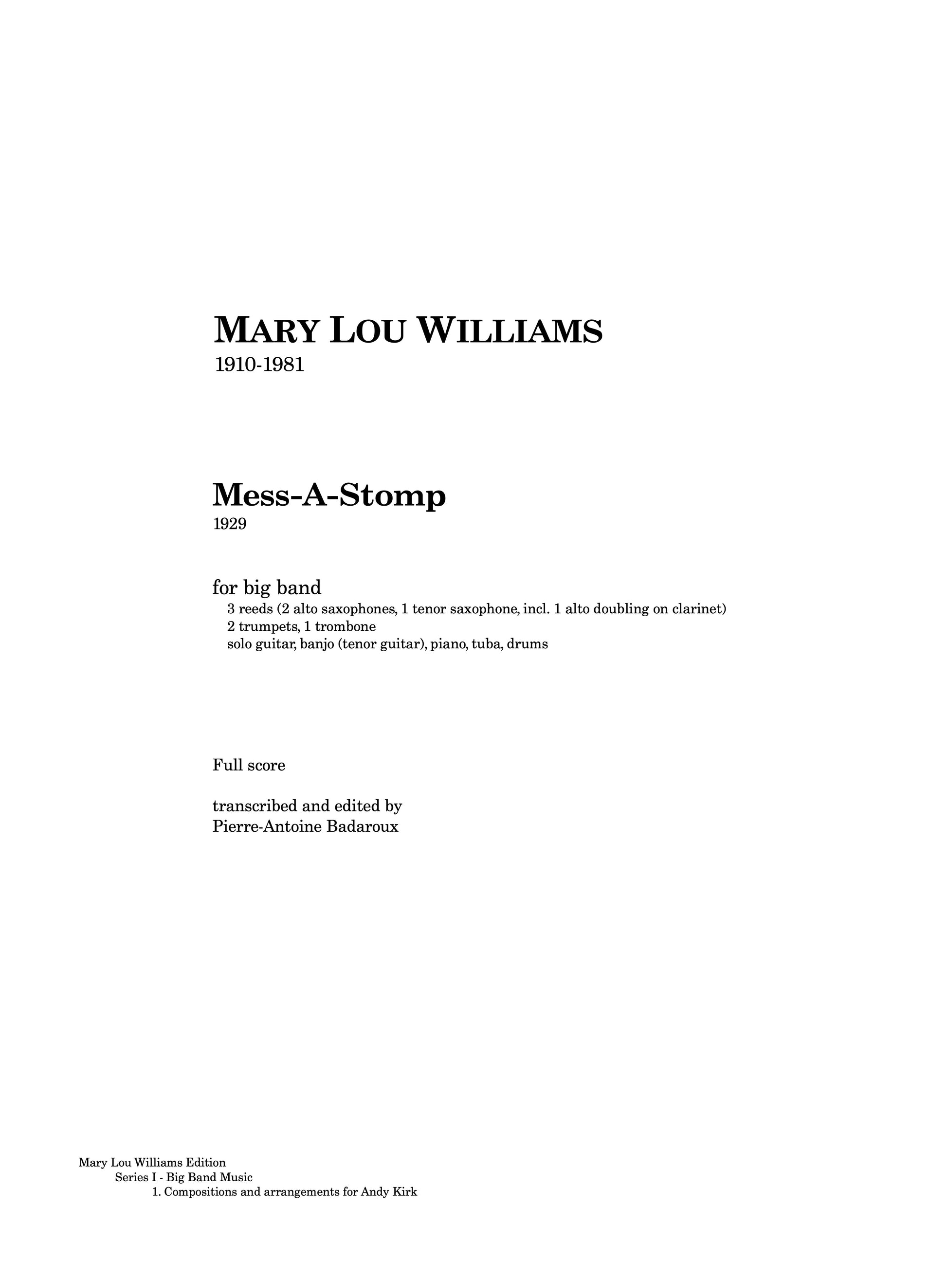 “Mess-A-Stomp” is Mary Lou Williams’ first recorded composition and probably her first ever notated and orchestrated composition. It was written for Andy Kirk and His Twelve Clouds of Joy on the occasion of a Brunswick recording session that took place circaNovember 07, 1929, in Kansas City.
